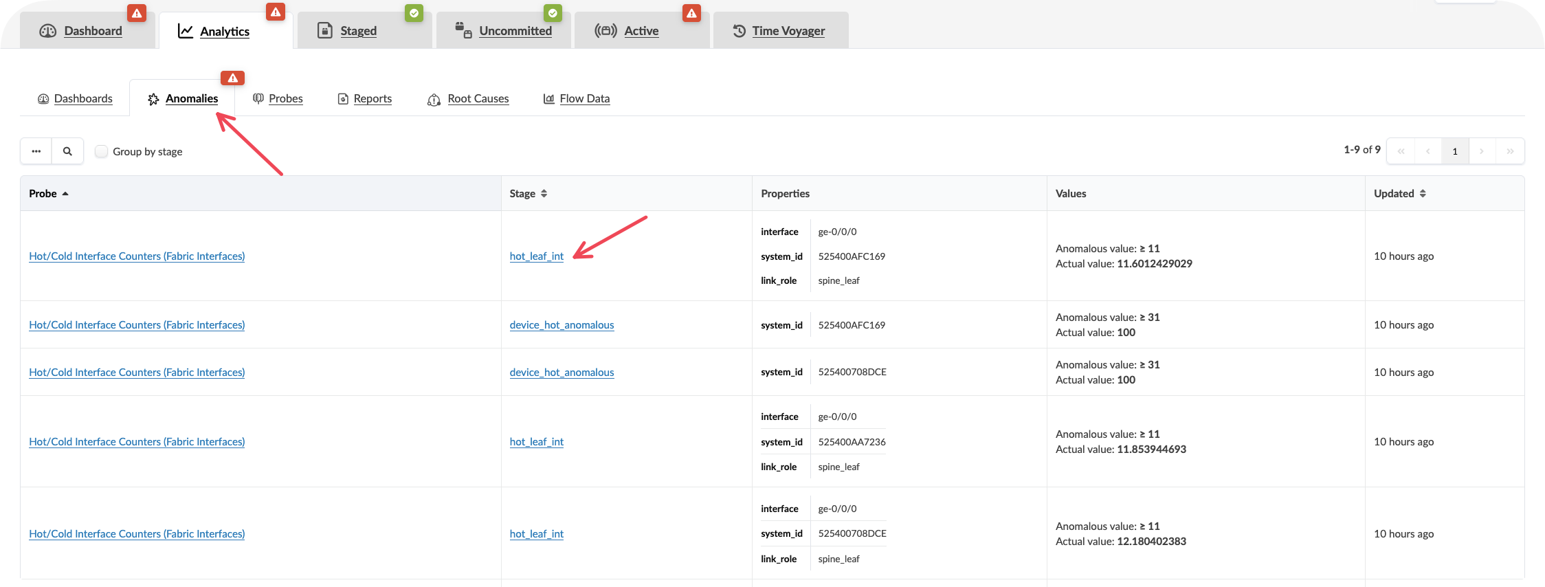 1. CLick On the Anomalies tab to see the raw anomaly alerts activated by probes. You can dive into information about the affected components by selecting the stage.