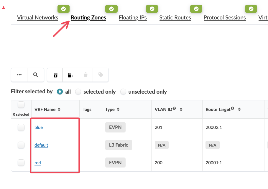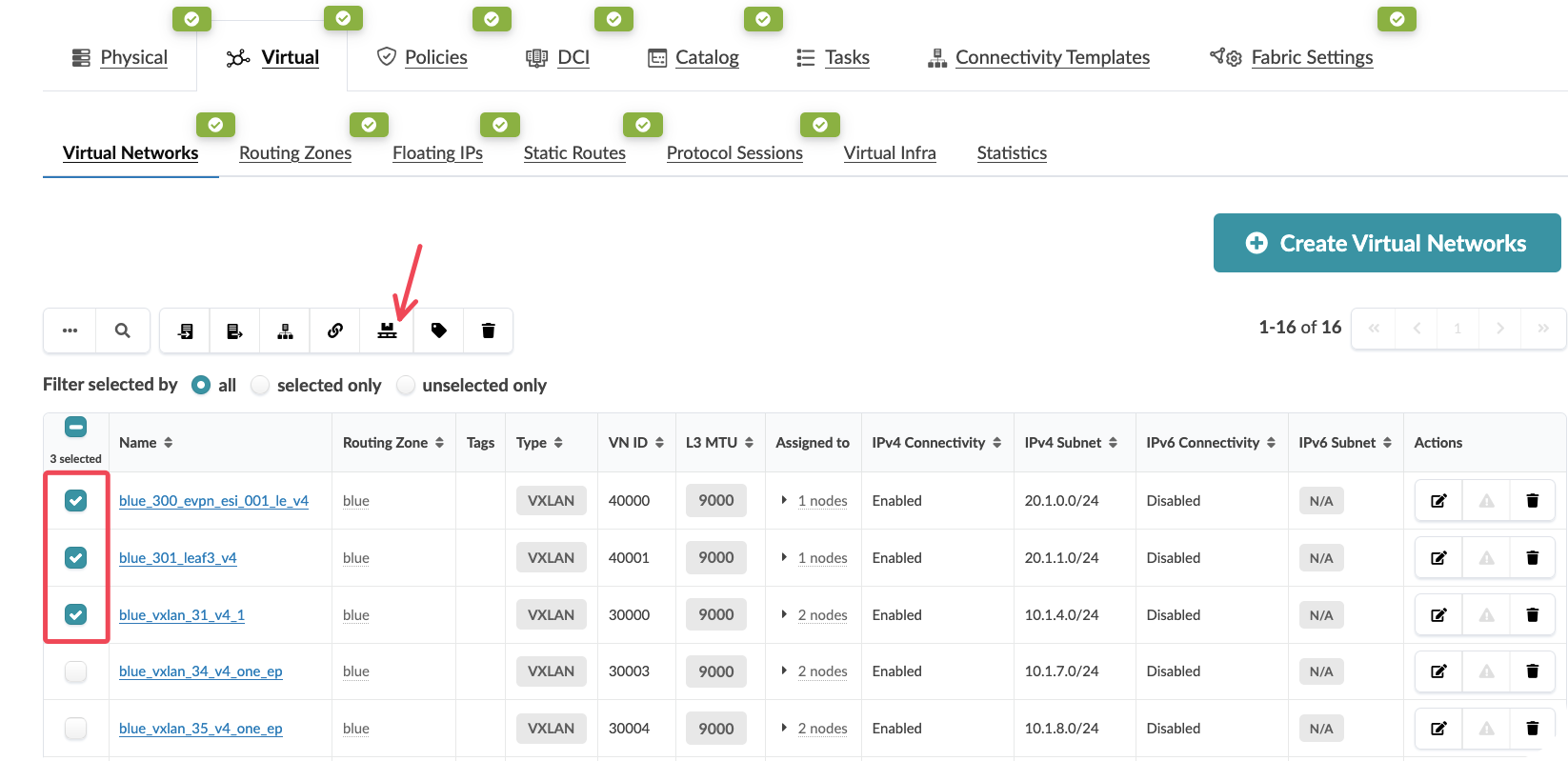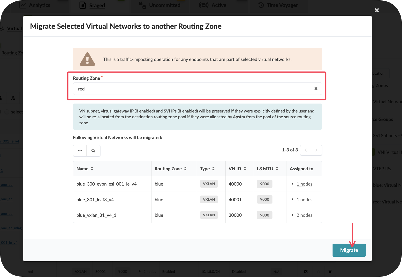1. After the migration completes, observe that the selected virtual networks now appear under the Red VRF